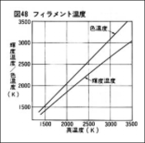 色温度計(カラーメーター)を使えば、その被測定電球の色温度は直接表示されます。輝度温度から換算する場合は、光高温計(パイロメーター、PYRO-METER)を使い、フィラメントの輝度温度を測定して換算します。