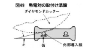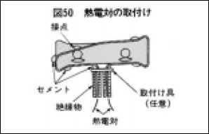 固定方法 …熱電対の接点は、露出した外部導入線と接点を、確実に接触させ、上からセメントを盛り固めます。さらに、熱電対は、切り込みの中で両方向に引張り、切り込み全体にセメントを充填します(図50)。