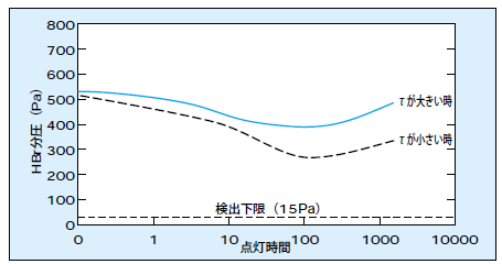 酸素放出はランプがどのような温度や環境の下で点灯されるのかという条件に依存することはもちろんである。裸点灯で用いられるか器具の中やミラーの中に入れられるのかという条件によって、寿命は大きく異なることがある。先の、図1と図2の例ではオープンかPAR内かによってCOやHBrの寿命経過時間に対する振る舞いが異なるのがそれである。