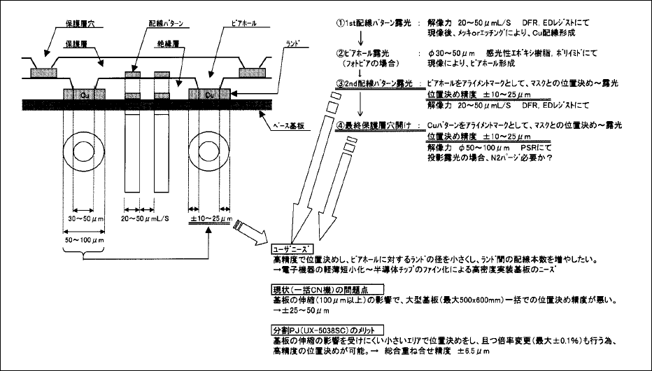 携帯電話、ノートPC等の電子機器の小型・軽量化、高速・高機能化に伴い、ICチップも高集積・高速化し、実装技術もQFP(リードがパッケージの4辺に設けられたタイプ)から、前述のBGA/CSP等の新実装形態へと移行してきている。それに伴い、ICチップを搭載する側のプリント基板も微細化、高密度化が要求され、ICチップと同様、配線を積層する方式であるビルトアップ基板の役割が重要になってきている。ビルトアップ基板のニーズとして一番大きいのは、微細化のため、高精度で位置決め(層間の重ね合せ)をして、ビアホール(層間を接続する目的であけられた穴)に対するランド(配線用パターンの先端に設けた丸型の導体パターン)の径を小さくし、ランド間の配線パターン本数を増やしたいというものである。このニーズは特に、ICチップが直接搭載されるパッケージ基板での要求が強い(ex.ランド径/ビア径=Φ60µm/Φ30µm)。(図2-4)