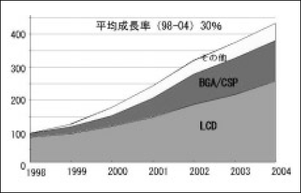 TAB市場全体としては、LCD、BGAやCSP、その他各種ICカード、プリンタ印字部、PDPドライバ等のアプリケーション毎に調査機関などが予測している。(図2-23)00-04年の平均成長は35mmテープ換算パーフォレーションベースで約30%/年の成長が見込まれている。これまでは、急成長する需要の中で供給面の課題が指摘され続けることが多かったが、これからは伸びる市場への対応力に加え、さらに高信頼性や低コスト化の提案をTABメーカの課題として受け止め、真摯に取り組む必要があろう。