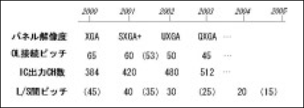 LCDドライバは、COG(チップ・オン・グラス=ガラス基板上の電極端子に直接ICを接続する方式)などのTABを使わない実装方法が出てきているものの、限界があり、TABの延長線上のテクノロジーとして、COF(チップ・オン・フレキ)が主流となると考える。COFの大きな特徴は、従来ドライバICのみを基板上に実装していたものが、同一基板上にチップコンデンサ等も実装することであり、その結果としてテープの巾広化(105mm→150mm、250mm)、ファインピッチ化(40µmピッチ→20µmピッチ)が進むことである。