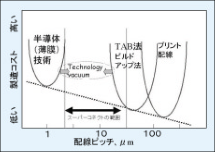 図2-25 各種配線形成技術の配線ピッチとコストの関係