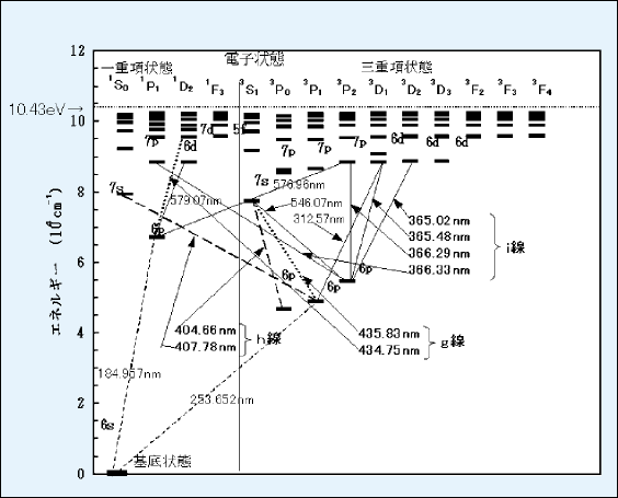 水銀は、原子核の周りに80個の電子がある。基底状態では最外殻の6s軌道に2個の電子が存在する。その電子配置は、1s2 2s2 2p6 3s2 3p6 3d10 4s2 4p6 4d10 4f14 5s2 5p6 5d10 6s2と表わされる。この最外殻の6s軌道にある2個の電子が励起準位に遷移する過程によって、種々の線スペクトルからなる光放射が発生する。電子状態と代表的な許容遷移を図4-4に示す。通常、露光に使用される水銀のラインは、g 線(436nm)、h線(405nm)、i線(365nm)である。これらの各線の中に、大きな遷移確率を有するものが含まれており、強い放射を得ることができる。これらのラインの共通点は、着目している遷移の下準位が63pの三重項の電子状態に落ちることである。