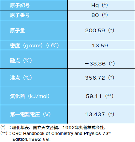 水銀は室温では液体の金属である。超高圧水銀ランプを点灯すると、ランプバルブの温度はおおむね400°C~700°Cにあり、中の水銀は完全蒸発し、数MPaの圧力に達している。ランプ点灯中、バルブは温度の高い部分と低い部分があり、バルブ内の蒸気圧はその最も低い温度に依存している。蒸気圧は、表4-2の参考文献を参照されたい。水銀の一般的な特性を表4-2にまとめる。