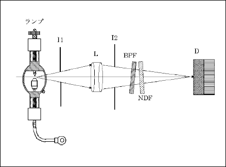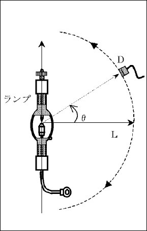 配光測定の概念図を図4-6に示す。ランプを中心とする半径Lの円上の各θの配光角で測定される。検出器には、ウシオ製のUVD-405PDが用いられる。