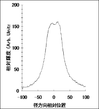 次に、図4-9で放射輝度の最大値を通る径方向と電極間の軸方向の放射輝度分布を図4-10と図4-11にそれぞれ示す。図4-10は、アーク柱の陰極先端近傍で測定したとき、中央が最大となる概略軸対称の形状をしている。図4-11は、電極間の軸方向分布を表わし、陰極附近で急峻な立ち上がりと立下りのある非常に高い放射輝度を成し、それに続いて陽極に向かうにしたがいなだらかに減少している。