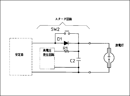 ランプの点灯回路は、安定器とスタータからなる。スタータは、ランプの電極間に高電圧を印加して、それらの間で電気的絶縁破壊を起こす役目がある。スタータには、高周波の高電圧を発生させるACスタータと直流の高電圧を発生させるDCスタータとがある。ACスタータの尖頭電圧はDCスタータのそれに比べ高い。ACスタータとDCスタータは、用途に応じて使い分けられている。PC-3500BYのランプを搭載した露光装置UX-5038SCでは、DCスタータが用いられている。