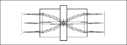 露光用のショートアークランプは、ワット数に応じて異なるが、陰極と陽極が数mmから十数mmの距離を持ち、対向して配置されている。そして照明用途に比べると電極間距離が短いタイプのランプである。その電極間でアーク放電を起こすと、アーク柱と呼ばれる放電部分から強い発光を生じる。アーク柱から放射される光は、四方八方に飛び散る発散光である。ランプからの発散光を直接露光に用いたのでは、全く放射照度が不足し、また光線がコリメイトされていないので適性な露光ができない。従って、ランプから放射した光を一旦集光鏡で集め、それから光を加工することで、高い露光面放射照度を得ている。このようにすることで、ランプからの放射光の利用効率を高めている。通常、集光鏡には楕円鏡が使用されている。ランプと楕円鏡の相対的位置関係を表わす概念図を、図4-1に示す。ランプは、アーク部分が楕円鏡の一方の焦点に位置するように置かれ、ランプから放射した光が楕円鏡で反射して他方の焦点に集光される。露光機では、このような集光鏡とランプがセットとなって備えられている。