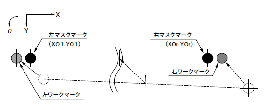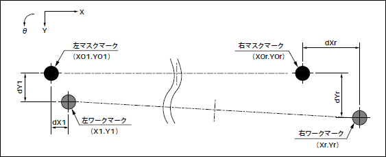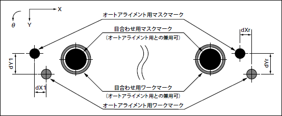 ワークにアライメントマークが無く、ワークの回転方向における露光精度が厳しく要求される場合、処理ステージ上で回転方向のアライメントを行う。方法は2箇所のマスクに開口したマークとオリフラをアライメントする。開発当初は光量センサによりエッジ検出していたが、設定が非常に煩わしく精度を維持する事が難しかった。現在は画像処理を用いて容易に高精度なアライメントを実現している。