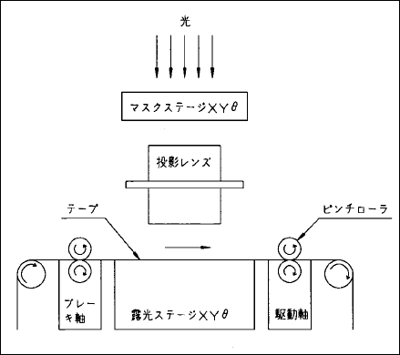 テープは駆動軸のピンチローラにより高速搬送される。搬送中はバックブローによりテープと露光ステージの接触を防止している。テープの搬送量は駆動軸とブレーキ軸により検出している。搬送停止後、テープは真空吸着され、アライメント、露光を行う。露光後はテープの真空吸着が解除され、再びバックブローを行いながら搬送される。