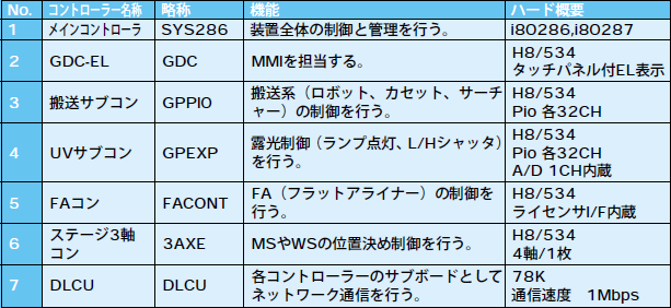 装置全体の制御と稼働管理をメインコントラーラの役割とし、各ユニットの機能はサブコントローラが制御している。すなわち、搬送制御は搬送サブコン、露光制御はUVサブコンというようにマクロ的な機能はサブコントローラ側で処理する。各コントローラ間はDLCUという独自のネットワークで結ばれており、メインコントローラにより協調制御されている。