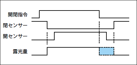露光量はシャッタ開指令が行われてから、「シャッタ閉出ない」を起点として積算を開始している。その後、設定量になったらシャッタ閉指令を出力しているが、シャッタの動作遅れ分が誤差となってしまう。(網掛け部)