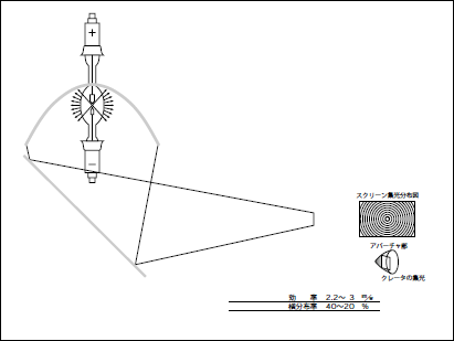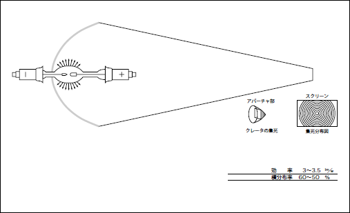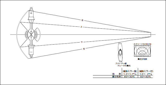 水平点灯の場合、深型の反射ミラーが使用できるので、集光効率は非常に良くなる。また、陰極を深型ミラー側に持ってくることにより、アークの最高輝度の点が有効に利用でき、垂直方式に比べて輝度分布が素晴らしく向上した。