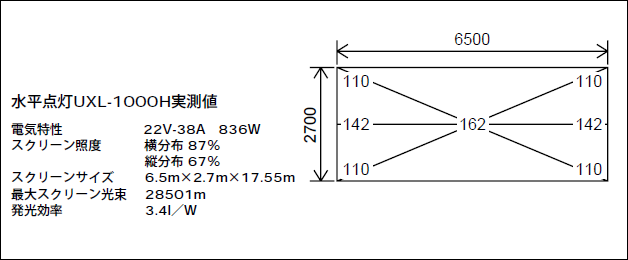 横分布・隅分布を50と30程度にすると、中心照度は2000lxに上昇する。最大スクリーン光束3500lm、発光効率4.2l/Wとなり、従来の垂直2000型(2kW)ランプハウスの性能以上の効果が得られた。引き続き2kWの水平ランプハウスの開発に入り、1967年2月にはテアトル銀座に設置し、好評を博した。そしてクセノンランプの水平点灯について、寿命や安全性、スクリーン上での輝度照度分布も良好であることが、業界にも認識されるようになった。1967年のSMPTE journalには、新製品として弊社の水平点灯方式が紹介され、それ以降世界中にクセノンランプの水平点灯が広がっていった。