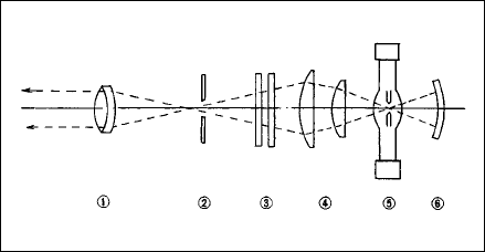 当時密着式の光源部は、超高圧水銀灯からの光束をバックミラーとコンデンサレンズで集光し、フィールドレンズで効率よくコリメータレンズに送り込み、コリメータレンズで平行光にするシステムであった。