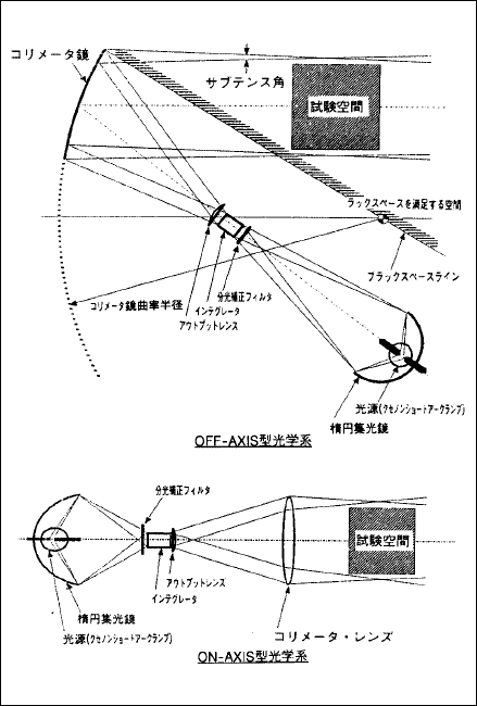 映画館用のクセノン光源は、1958年に商品化され、その後次々と大型クセノンランプが開発・実用化された。もともと照明用として開発されたもので、管球の角度が±15度の範囲とされており、全てが垂直点灯方式であった。このランプは、1966年には約1350~1400館まで普及した。当時のランプハウスの光学設計は、各社それぞれの特徴を活かし、垂直点灯(図5-1)方式、垂直点灯(図5-2)方式であった。そこに(3)で後述する、新しく開発された水平点灯(図5-3)方式が浸透していくこととなる。いずれもクセノン独自の輝度分布を活かした方法である。