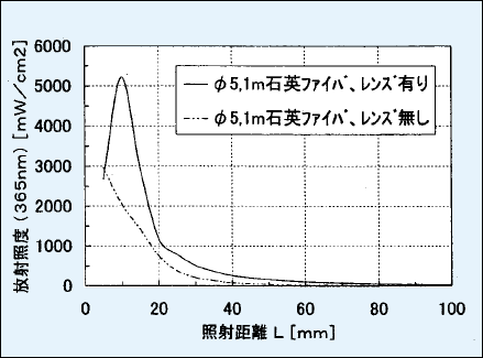 ランプの発光部は点光源に近いので、楕円集光鏡で光を集めて次の光学部品(ファイバやインテグレータ)に渡す。光路を短くするために、途中で一度折り返すための平面鏡を入れる。また、集光鏡と平面鏡は多層膜蒸着をして、露光に関係のない光をできるだけ少なくしている。これは短波長の光がレンズなどを劣化し、長波長の光は露光しようとする対象物の温度を上昇させていろいろな不具合を生じさせるためである。(図5-53)超高圧水銀ランプはその名のごとく、放電が安定したときの水銀の蒸気圧が十数気圧になる。この蒸気圧を保つために放電ランプの管壁温度が約600°Cにもなる。だからランプハウスの構造には火傷などの危険のない、例えばハウスを触っても暖かい程度にしなければならない。また、ランプの放電部分は1~2mm程度であるので、温度が上がって光軸がずれてしまうと、照度が落ちるだけではなく、照度均一度も悪くなってしまう。そこで、主な光学部品(ランプ、集光鏡等)は一つの鋳物部品に貼り付け、光路が歪まない様にし、それ全体を更に2重の板金で覆い、温度の対策をする構造にした。