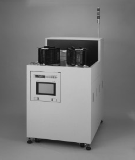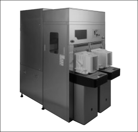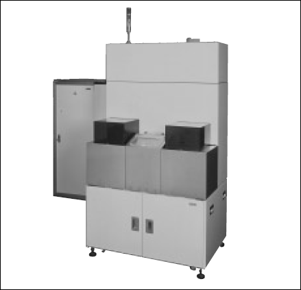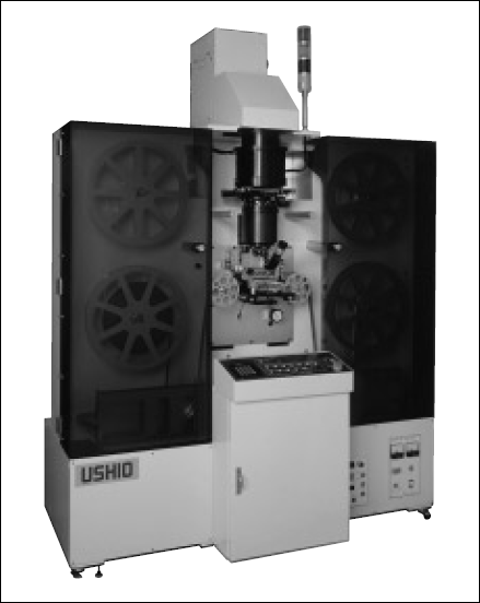 現在、TABテープは液晶ドライバ、T-BGA、CSPなどいろいろなところで使われているが、当時は存在があまり知られていなかった。仕様書を持って営業と技術が一緒にお客様を回っているうちに、面積は小さいが投影露光でテープ上にパターンを作っている会社があることを知った。それが現在のTABテープだったのである。当時は5~6社であったと思う。それらの会社はB社の露光装置を使っており、ランプハウスの仕様から、ウシオのランプハウスを載せ変えること(レトロフィット)で生産性を上げる可能性が十分にあった。実際、載せ変えてみると照度は上がり、パターンの切れも良くなり、実質的に生産性が2~3倍になったのではないかと思う。これがお客様の信頼を得るきっかけになり、TAB露光装置を作ることに繋がっていった。(図5-56)これら以外にも150mm幅テープのコンタクト露光用、液晶カラーフィルタ用などに実際に使用した例もあるが、いずれにしても光源部を標準化したことが、お客様にとってもウシオにとっても良い方向に働いたのではないかと思う。