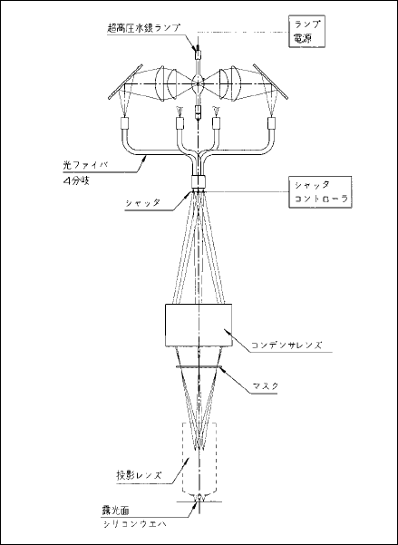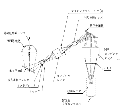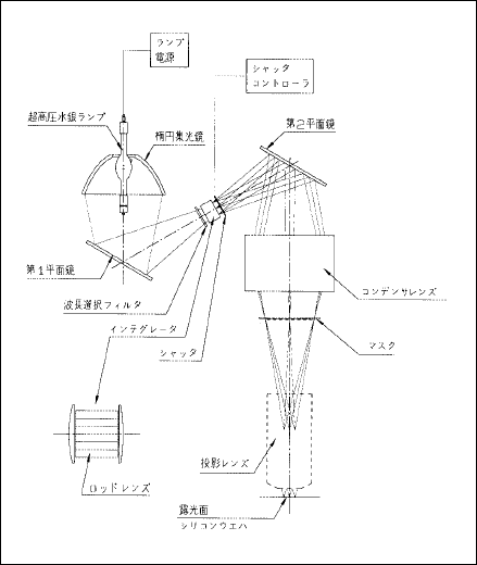 投影レンズ式露光装置とはICの製造工程の中のフォトエッチング工程で、フォトマスク(IC の図形)をシリコンウエハに投影レンズで焼き付ける装置である。