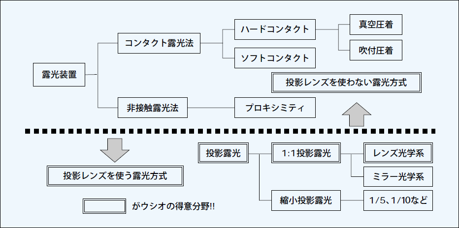 後者の「マスクとワークとを離して露光するもの」は、更に「わずかな隙間をあけて露光するもの」と「投影レンズを使用しマスクとワークを完全に分離して露光するもの」に分類される。わずかな隙間をあけて露光する方法はプロキシミティ露光法と呼ばれ、日光写真の通用する範囲内でマスクとワークに隙間をあけ、マスクダメージを軽減させる工夫がしてある。それに対し投影露光法は投影レンズによってマスクとワークが完全に分離可能な方式である。このためマスクダメージがない。しかしながら装置の性能を投影レンズが左右することになる。露光装置開発にあたりウシオでは、上述のとおりマスクにダメージがなく、また焦点深度の確保に有利な「投影露光方式」に着目した。そして「投影露光装置」を開発のターゲットとしたのである。