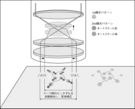 アライメントの開発投影レンズは一般的に露光波長で収差が出ないような設計を行っている。高い解像力が要求されないような場合は、感光材に反応しない546nm(e線)と露光波長の2線で収差補正を行う。しかし、近年のように高い解像力と広い有効露光領域で露光を行うような場合は、前述の方法による設計が困難となる。従って、高解像力化と有効領域の拡大に対応するには、投影レンズを通った露光波長でマスクマークとワークマークを観察し、相対位置をアライメントする必要がある。しかし、アライメント時に露光光を照射すると、アライメントを行わないマスクとワークの相対位置は当然の事ながら合っていない状態なので、位置が合っていない状態のまま露光されてしまう結果となる。また、ドライフィルムレジスト等の感光材では露光時に着色するのが一般的で、ワークのマークの視認性がアライメント途中に変化する事にもなる。このような問題点を解決するための方法として、TTLオンアクシス非露光波長アライメント(ミラーアライメント方式)を開発した。詳細は4.4アライメント系に記載してある。
