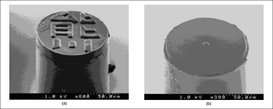 図6-1 光ファイバ端面に形成したレジストパターン(a)、およびこれで光ファイバ先端に形成したレンズ(b)