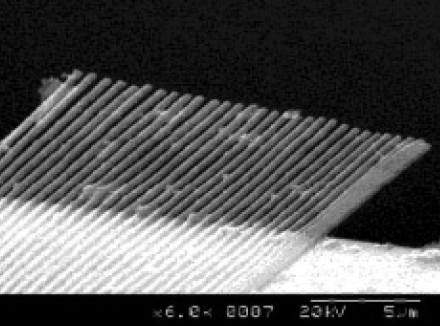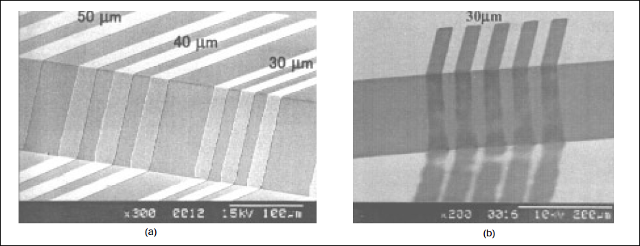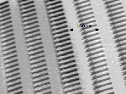 幅が狭くて深い構造すなわち高アスペクト比の構造をレジスト露光で製作する研究が行なわれている。普通のレジストではアスペクト比が5程度にしかならないが、エポキシ系レジストのSU-8(日本マクダーミッド社)を用いると15程にすることもできる6)。なおこれらをめっきのための鋳型などに用いる場合には、最後にレジストを除去できる必要もある。PMMAをレジストに用いてX 線(放射光)で露光すると100以上のアスペクト比になる。これを鋳型にして電気めっきしたり、さらにその電気めっきによる構造体を鋳型に用いてポリマー成型なども行うことができ、この技術はLIGAプロセスと呼ばれる7)。PMMAの場合は光を照射した部分が分解して除去され、いわばポジ型レジストである。これに対してLIGAプロセス用のネガ型レジストの技術もある8)。PMMAを加速した水素イオンの照射で露光したプロトンリソグラフィの場合は、加速エネルギに対応した深さでプロトンが止まるため、特定の深さまで掘られた構造を作ることができる9)。