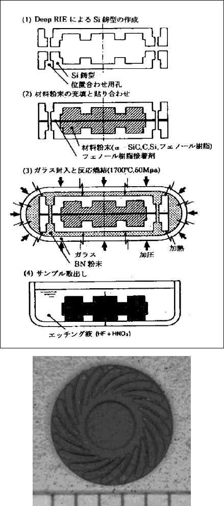 気体中で反応させ、蒸発させて除去するドライエッチングには、等方的なガスエッチングやプラズマエッチングの他、ある方向にエッチングが行なわれるイオンエッチングや反応性イオンエッチング(RIE)がある。また電気的に中性な原子を加速してエッチングに用いる高速原子線エッチング(FAB)も用いられる。ガスエッチングではHFガスでSiO2をエッチングしたり、XeF2ガスでSiをエッチングしたりできる。またO2を用いたプラズマエッチングはレジストなどの高分子膜の除去に用いられる。この技術を犠牲層エッチングに用いた場合は乾燥の必要がないため、上で述べた張り付きの問題は軽減される。RIEで深く加工するDeep RIEと呼ばれる技術について述べる。SiのエッチングはSF6とC4 F8 のガスを交互に導入してエッチングと側壁保護を繰り返す方法により、アスペクト比が50にもなる構造を毎分数µmのエッチング速度で作ることができる14)。SiのDeep RIE を行った後、側面をSiO2で保護し上下からXeF2ガスでSiをエッチングすると、幅と厚みの両方の寸法をを独立に制御して微細構造体を作ることもできる15)。図6-3にはDeep RIEで加工したSiを鋳型にして高温の等方加圧下で焼結しSiCセラミックの微細構造体を製作する方法を示してある16)。同様の方法でPZT(チタン酸ジルコン酸鉛)の微細構造も製作されている17)。