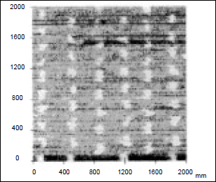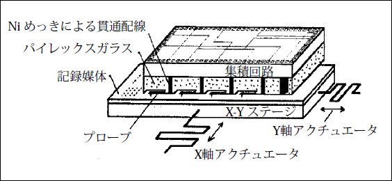 多数のプローブで並列に記録読出を行うマルチプローブデータストレージの研究を紹介する19)。図6-5はその構成であり、記録媒体はプローブのピッチ分だけ2次元的に動き、現在の100倍にあたる1Tbit/inch2の記録密度ができる。大きさ30nmの微細なヒータを形成した熱形マイクロプローブを製作した。このヒータは先端の微小開口部に形成されており、その開口を形成するには、シリコンの結晶異方性エッチングで形成したV形の凹みを酸化する際に、凹みの先で応力のために酸化速度が遅くなる性質を利用している。これを多数(32×32)配列したマルチサーマルプローブの写真を図6-6に、これを用いてGeSbTeの相変化記録媒体に記録した例を図6-7に示す。記録媒体の書込部は導電率が変化するためこれで読出ができ、同図はこれで画像化したものである。各プローブからは図6-4に示したガラスの貫通配線を通して裏面の集積回路に接続される。
