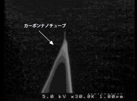 図6-9はカーボンナノチューブ(CNT)をシリコンの先端に形成したもので、成長させる部分に触媒となるNiをSTMで電界蒸発させたり、Niを付けた基板に電圧を印加して先端部に電界を集中させたりすることで選択的に成長させている22)。CNTの成長装置では水素とアセチレンの混合ガスをタングステンフィラメントで分解して堆積する。