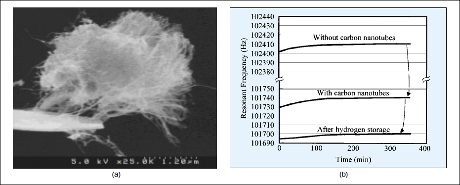 図6-10 厚さ20nmシリコン片持ち梁上のカーボンナノチューブ(a)と共振周波数変化によるカーボンナノチューブの水素吸蔵量の測定(測定結果:6 重量%)(b)