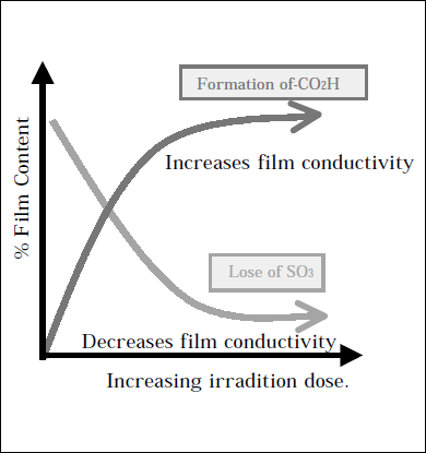 IR (ATR) spectroscopy was used to probe the effects of EB exposure on a molecularlevel, revealing generation of CO2H units at the site of the polymer backbone polymer and the concurrent loss of the Nafion® hydrophilic (- OCF2 - C(CF3) - F - )n -OCF2CF2 - SO3H side chain.4 Both mechanisms can be shown to be a function of irradiationdose and have opposing effects regarding the physical properties highlighted for FC technology. Hence, a complex relationship with respect to irradiation dose is expected (figure 2), making EB exposure a potential tool to prepare materials with the rare combination of low methanol permeability and high conductivity. These observations are supported by the physical properties of the bulk materials.