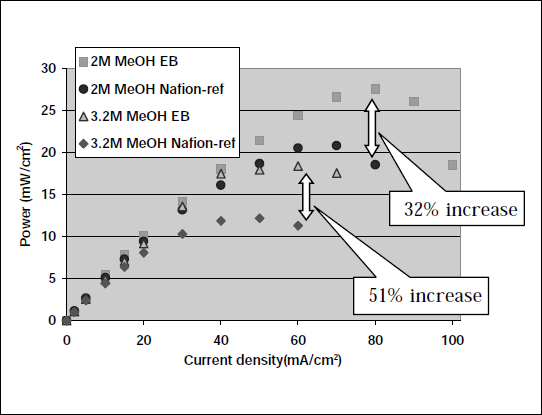 Electron beam (EB) irradiation experiments were carried out using a low dose EB irradiation unit, MINEB-LAB from Ushio Inc. Japan. Typical irradiation conditions include an accelerating voltage of 35kV, with a tube current of 300µA/tube and scan speed of 3m/min (resulting in a dose/scan rate of 2.5µC/cm2 (uniformity +/-15%), carried out at <200ppm oxygen, EB penetration depth <10µm. DMFC operating conditions: a liquid feed system with no backing pressure, operating at 60°C, air flow 60ccmin-1 , methanol feed 0.6ccmin-1 .
