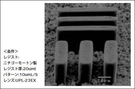 上記①、②を±40um(Range:80um)の焦点深度内で達成できる。基板厚の面内ばらつきに対しても対応しており、良好なレジストパターンを形成する事ができる。