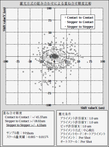露光機には、全面一括のフィルムコンタクト露光機、および、弊社製分割投影露光機(UX-5038SC;有効口径Φ200mm以下ステッパ)を使用し、①第1層、第2層共コンタクト機、②第1層コンタクト機、第2層ステッパ、③第1層、第2層共ステッパの3条件で精度比較を行った。