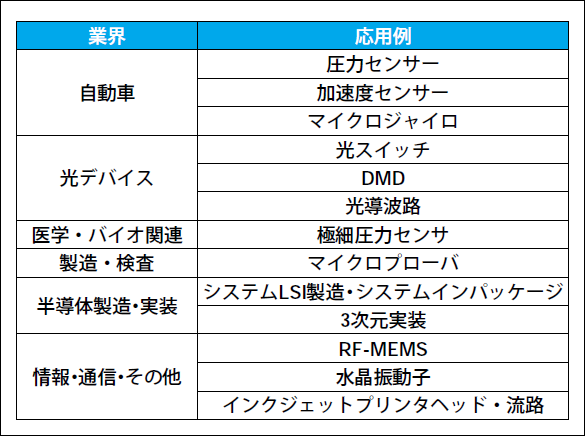 マイクロマシンは、80年代後半から学会を中心に研究開発が進み、既に圧力センサー・加速度センサー・マイクロジャイロ等のデバイスが実用化されている。最近では、光スイッチなどの光デバイス・高周波デバイス(RF-MEMS)・バイオ関連等においても応用が期待され、またシステムLSI製造においてセンサ・アクチュエータなどの個別部品を1チップ化する技術への適応も注目されている。このようにマイクロマシン技術は半導体製造技術とも融合し、その応用範囲が急速に拡大している。