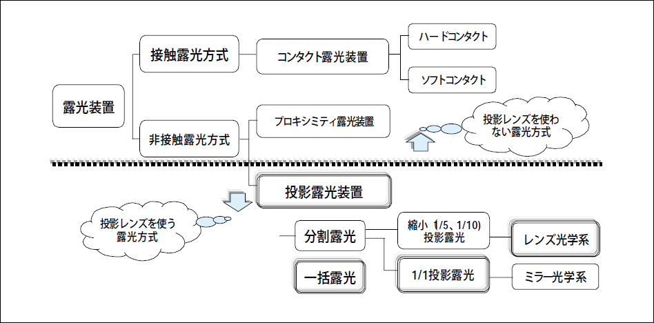 露光装置はその露光方式によって、コンタクト/プロキシミティー露光装置、一括投影露光装置および分割投影露光装置に分類される。露光装置の性能(解像性能・重ね合わせ性能)や生産性(処理能力・装置コスト)は、これらの露光方式によって大きく左右される。
