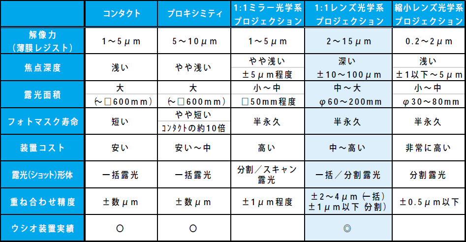 上記のように、各種露光方式にはそれぞれ一長一短がある。その選択は、実際の露光工程に要求される要素・性能と各露光方式の特徴をよく理解し行う必要がある。