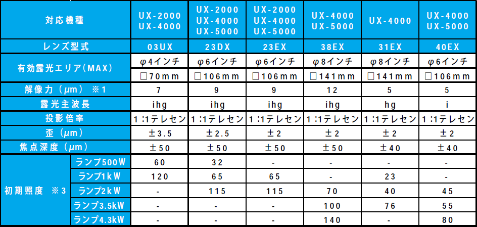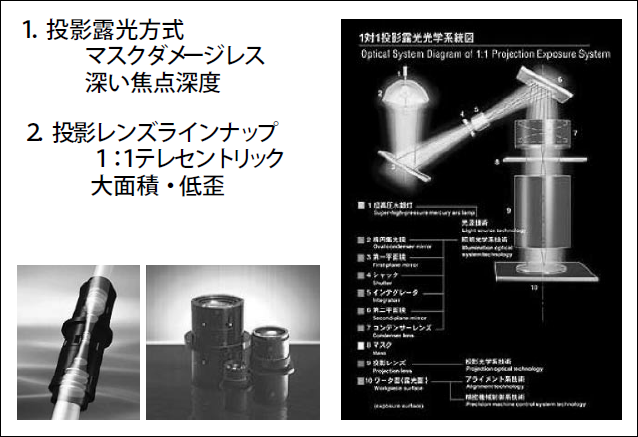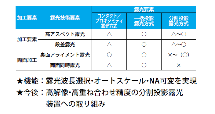更に当社では、厚膜・高アスペクト比露光プロセスに効果的な「露光波長選択」技術、温度他で伸縮するワーク材料の使用時でも高精度な重ね合わせを実現する「オートスケール機能」、投影レンズのNAを変更可能とし解像性能優先と焦点深度優先を使い分ける「NA可変機能」らも実現しており、応用範囲の拡大による露光技術要素の多様化に対応しているまた今後の高精度なニーズに対応すべく分割投影露光方式への取り組みも開始している。
