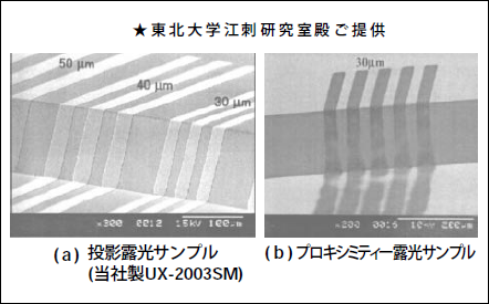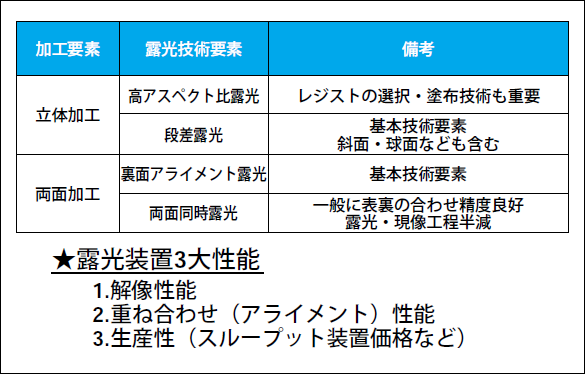 その代表的な要素は、「高アスペクト比露光」と「段差露光」である。これらは、立体的な加工を特徴とするマイクロマシンにとって重要なポイントであり、これら要素が露光方式選定の基準ともなる。また通常の両面加工時には、裏面に設けられたアライメントマークを用いて表面に露光するパターンの位置合わせを行う「裏面アライメント露光」が行われる。更に必要に応じ表裏面に露光するパターン同志を予め位置合わせし両面を同時に露光する「両面同時露光」も行われており、露光現像工程の半減により生産性の向上につながっている。これらの「裏面アライメント露光」「両面同時露光」もマイクロマシン露光技術の大切な要素である。