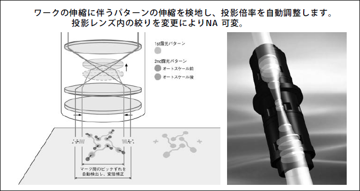 更に当社では、厚膜・高アスペクト比露光プロセスに効果的な「露光波長選択」技術、温度他で伸縮するワーク材料の使用時でも高精度な重ね合わせを実現する「オートスケール機能」、投影レンズのNAを変更可能とし解像性能優先と焦点深度優先を使い分ける「NA可変機能」らも実現しており、応用範囲の拡大による露光技術要素の多様化に対応しているまた今後の高精度なニーズに対応すべく分割投影露光方式への取り組みも開始している。