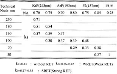 Table 1 Technology node, NA àd K1 factor