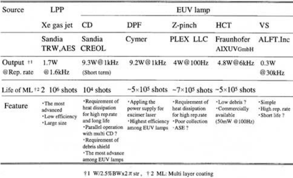 Table 3 Status of EUV source candidates.