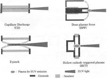 EUVランプとして,Table3あるいはFig.6に示すキャピラリ放電(CD:Capillary discharge),真空スパーク(VS:Vacuum spark)およびピンチ放電を用いたZ-ピンチ(Z-pinch),デンスプラズマフォーカス(DPF:Dens plasma focus),ホロー陰極プラズマ着火Z-ピンチ(HCT:Hollow cathode triggered pinch plasma)が開発されている.