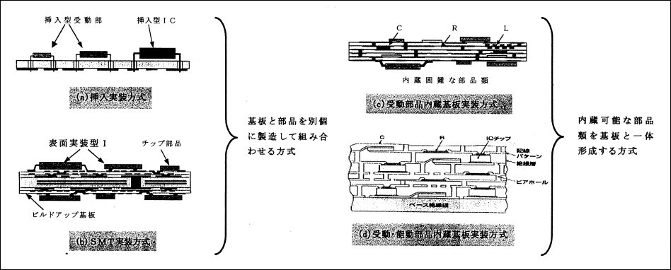 図1 基板実装は挿入実装からSMT実装、受動部品内蔵基板実装、そして受動・能動部品内蔵基板実装方式へ
