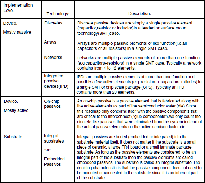 IECからは1999年と2000年に技術ドキュメントが発行され、受動部品の用語標準化(Table1)の呼びかけがあり、日本電子機械工業会(現・電子情報技術産業協会)で検討を進めています。Table1で受動部品の呼称としては、パッシブ中心で考えると、従来の単体チップ部品のほか、複数個の抵抗やコンデンサを1パッケージに入れたアレイやネットワークがありますが、新しい集積化受動部品や部品内蔵基板では、IPD(Integrated Passive Device)とかIntegrated Substrate、Embedded Passivesなどの用語を提案してきています。部品メーカーや基板メーカーはこの辺に注目する必要があるといっています。
