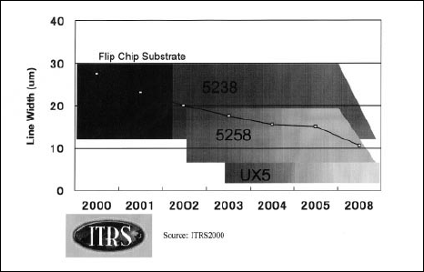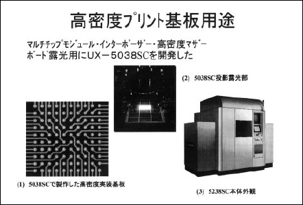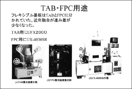 BGA、CSPという実装形態が新しく加わってきたことにおいて、特徴的なことは、特にTCPと呼ばれる実装部品が台頭してきたことではないかと思います。BGA、CSPにはリジッド基板を使ったものもありますがTABテープ技術を使って製作することもあります。数年間のTAB露光装置出荷台数の推移などを見ていますと、詳細な数字はお話できませんがBGA、CSP用途の出荷大半を占めるような時期もありました。TABはLCDのドライバー用の配線部材として知られていますが、その他の用途への展開も最近は具体化てきています。これらの部品を作る装置として、ウシオの露光装置はかなり高いシェアでお客様に使用して頂いています。一方、FPCと呼ばれる形態のワークを処理する場合はプロキシミティ、コンタクト、プロジェクションの色々な方式の装置を使うことがあります。