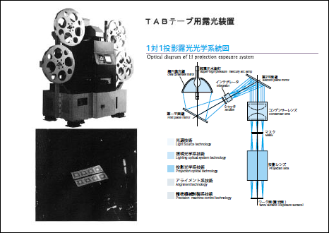 ではウシオ電機はこのような状況に対してどのような取組をしてきているのかをお話します。ウシオ電機には大きく分けて2つの事業部があります。ウシオ電機に対するお客様の認識はランプを作っている事業(ランプ事業部と言っています)です。こちらは工業用の特殊光源を作っている部門でワールドワイドであることでも有名だと思います。これとは別の、もう一つの事業部が私たちの所属しているシステム事業部です。システム事業部では各種の特殊光源を使った製造装置の開発製造の対応を行っています。どのようなものを作っているかというと、紫外線UVを使った乾燥装置や硬化装置などが4種類位と露光装置があります。露光装置は大きく3つに分類されています。一つは、高密度プリント基板用のステッパです。2つ目がTAB・FPC用途ということで、テープ材を取り扱う露光装置です。テープ材というのはロール状に巻かれているものをロールのまま搬送して、逐次1ショット、1ショット打っていくというタイプです。この中に2機種、3機種あります。一番新しいタイプのTABテープ用の露光装置をご紹介します。これはテープ自体の幅が96mmのものを使用して、48mm幅のものを2条で取り、Φ150mmくらいのエリアで露光していきます。投影露光という方式を使っているのでマスクとワークが離れているというのが特長です。ちなみに最も大きいレンズではマスクとワークの距離は1.3m位です。3番目が、半導体の後工程用途ということでの装置を作っています。こちらのものは、UX-4031SCという8インチのウエハを一括で投影露光するというタイプのものやUX-3000シリーズというものがあります。こちらは、プロキシミティコンタクト露光装置です。いずれも半導体の後工程に導入するわけですが、なるべく一括で生産効率が良くて安い装置を供給する目的でこのような装置を開発しました。半導体用のステッパを使うと、非常に生産のコストがかかります。生産コストをなるべく押さえたいということがお客様のニーズです。