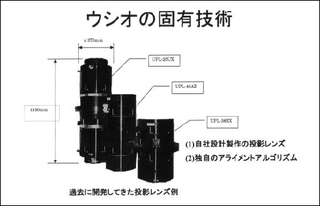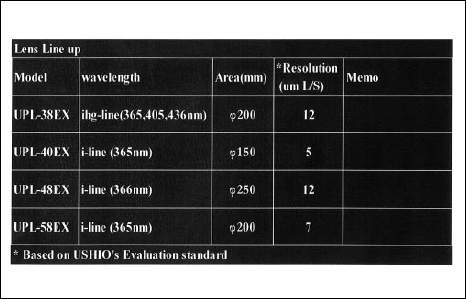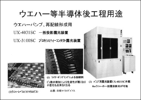 ではウシオ電機はこのような状況に対してどのような取組をしてきているのかをお話します。ウシオ電機には大きく分けて2つの事業部があります。ウシオ電機に対するお客様の認識はランプを作っている事業(ランプ事業部と言っています)です。こちらは工業用の特殊光源を作っている部門でワールドワイドであることでも有名だと思います。これとは別の、もう一つの事業部が私たちの所属しているシステム事業部です。システム事業部では各種の特殊光源を使った製造装置の開発製造の対応を行っています。どのようなものを作っているかというと、紫外線UVを使った乾燥装置や硬化装置などが4種類位と露光装置があります。露光装置は大きく3つに分類されています。一つは、高密度プリント基板用のステッパです。2つ目がTAB・FPC用途ということで、テープ材を取り扱う露光装置です。テープ材というのはロール状に巻かれているものをロールのまま搬送して、逐次1ショット、1ショット打っていくというタイプです。この中に2機種、3機種あります。一番新しいタイプのTABテープ用の露光装置をご紹介します。これはテープ自体の幅が96mmのものを使用して、48mm幅のものを2条で取り、Φ150mmくらいのエリアで露光していきます。投影露光という方式を使っているのでマスクとワークが離れているというのが特長です。ちなみに最も大きいレンズではマスクとワークの距離は1.3m位です。3番目が、半導体の後工程用途ということでの装置を作っています。こちらのものは、UX-4031SCという8インチのウエハを一括で投影露光するというタイプのものやUX-3000シリーズというものがあります。こちらは、プロキシミティコンタクト露光装置です。いずれも半導体の後工程に導入するわけですが、なるべく一括で生産効率が良くて安い装置を供給する目的でこのような装置を開発しました。半導体用のステッパを使うと、非常に生産のコストがかかります。生産コストをなるべく押さえたいということがお客様のニーズです。